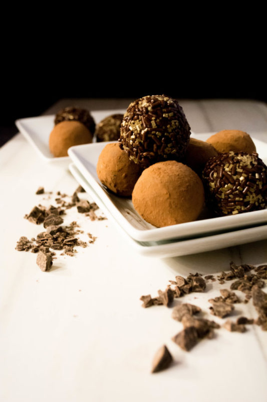 Coat in cacao or sprinkles by rolling ball on plate