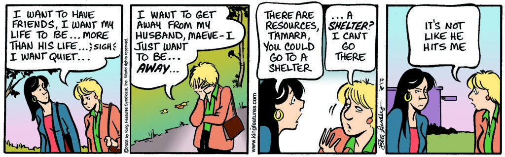 Sandra Bell-Lundy: My criteria for what I write about in Between Friends is (1) things that I have interest in and (2) issues that gel with the premise of my strip and its characters. There probably isn't anything that would be too serious to bring into the strip if it felt like it was a natural fit to discuss. If the topic was particularly unsettling (such as the domestic abuse series) it would require careful editing because the mainstream newspaper comic page is pretty G-rated.